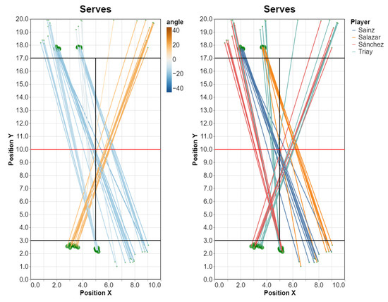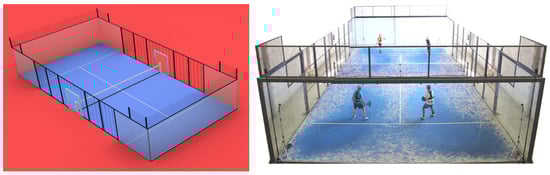 Padel is a modern racket sport that is becoming increasingly popular worldwide [1,2,3]. Although padel shares some features with squash and tennis, it also has important distinctive characteristics [3,4]. As in tennis, the court (20 × 10 m) is divided by a central net, but one of the most important differences between padel and tennis is that the padel court is delimited by walls (glass and metal mesh) except for two openings at the outer side of the net (Figure 1). Players are allowed to return the ball after it bounces on the walls, which decreases the technical ability to begin practicing it, and results in a varied range of shot types [5]. Furthermore, the serve in padel requires the player to bounce the ball and hit it below the hip. Unlike tennis, padel is essentially a doubles game, and thus partners need to collaborate to return the ball and to disturb the opponents to win the point. At the same time, padel is an open sport that requires constant decision-making, and the technical-tactical behavior of the player has an enormous and endless margin for evolution. This explains why the analysis of padel matches is so attractive and justifies the need of tools allowing researchers and coaches to access the data to understand and study them.