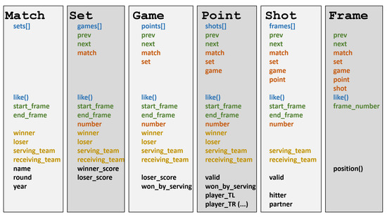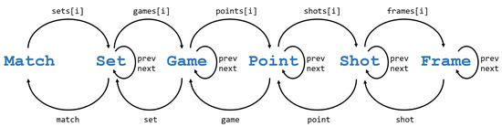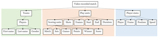 The FD of a video-recorded padel match is shown in Figure 2. The diagram shows the main features of the basic questions on padel match: who (teams, players), when (temporal play units), and how/where (position, speed, type of shot). As shown in the diagram, a padel match involves two teams composed of players that can be identified by their names. On a temporal plane, we can distinguish four scoring units in padel (as in tennis): match, set, game and point. Each of these scoring units have a winner (winning team) and results in a score update. Other smaller temporal units are the shots and the frames of the video. Although a shot is an event, we can also consider the temporal unit between one shot and the next; similarly, we will use the term point to refer to the temporal unit (often called rally) between a serve and the moment where one of the teams wins the point. Altogether, a video-recorded padel match can be broken down into these play units, as illustrated in Figure 3. As such, each play unit has a start time, an end time, and a duration.