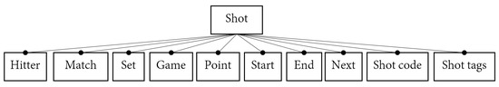 We can further analyze each of these concepts. For the sake of brevity, we only focus on shots, since they represent arguably the most relevant technical actions in padel. Figure 4 shows the FD of a shot in padel. A shot starts with some player (hitter) hitting the ball. The shot belongs to a specific match, set, game, and point, as shown in Figure 3. Shots have a start frame (when the player hits the ball) and an end frame (corresponding to the next shot, or end of the rally). Finally, shots have a collection of properties (such as the shot code) that, due to their complexity, will be discussed later in Section 7.