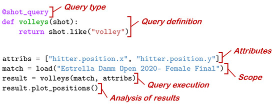 The first block of Table 4 refers to concepts related to video-based padel matches (Figure 2). All these concepts are translated into Python classes or class properties. The second and third blocks refer to queries about matches (Figure 5). Essentially, a query definition corresponds to the definition of a Python function, and a query execution translates into a function call. We use Python decorators to simplify queries as much as possible. A decorator is a simple mechanism of the Python language for defining higher-order functions, that is, functions that take another function and extend its behavior. This mechanism is convenient because it moves a large part of the boilerplate code from the query definition to the internal implementation of the API.