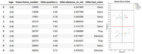 Notice that we had to loop over the DataFrame (df) rows because the filter involves multiple rows (we are looking for a specific shot sequence). Notice also the use of index offsets, which decreases readability. Finally, we have assumed that the input DataFrame has already been enriched with additional columns (e.g., distance of the player from the net). Otherwise, extra code would be required to compute these columns. This code might not be straightforward if, for example, the filter involves data from other DataFrames (e.g., to relate who played the volley with the team that won the point).