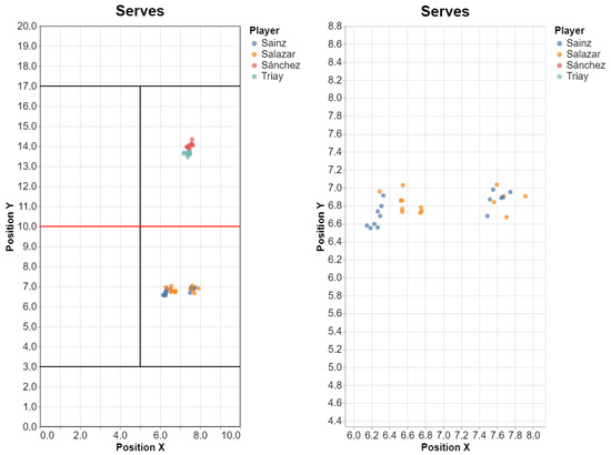 Concerning E3, we could plot the court-space position of server partners, and analyze e.g., whether the distance d n to the network and the distance d w to the lateral wall are normally distributed. If so, we could compute a simple Gaussian model for these variables, e.g., d n N μ n , σ n 2 ) , where the parameters μ n , σ n 2 can be estimated from the data.