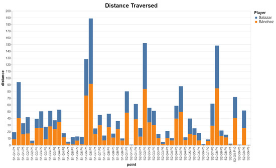 A video of a padel match contains valuable information that can be hardly captured in tabular formats, such as the exact poses throughout the execution of a technical action, verbal communication between players, and non-verbal communication (e.g., gestures when rivals try to avoid playing to a particular player). Although sometimes we wish to analyze the data through abstraction, an essential part of the exploratory analysis is to interactively examine the details of specific situations. In traditional motion data analysis, the tabular data are often explored independently from its video source, with some notable exceptions such as [38]. This prevents sports analysts from performing a deep analysis of the data. For example, after finding that some player often loses the point after a particular technical action (e.g., an off-the-wall smash), a coach might want to retrieve all segments of the video where this situation occurs. Our solution to this problem is to provide interactive plots where, whenever possible, data items include links to the part of the video where they occur. If appropriate tools are used, this kind of plot greatly speeds-up the analysis of context information (body orientation, feet positioning, impact location and timing) that can provide valuable insights to improve the player’s performance.