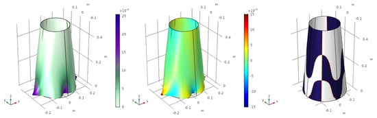 Figure 2 (left)) represents the biggest displacement (in magnitude), while the white part shows the smallest one, near the boundary conditions. The electrode profile (