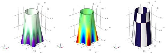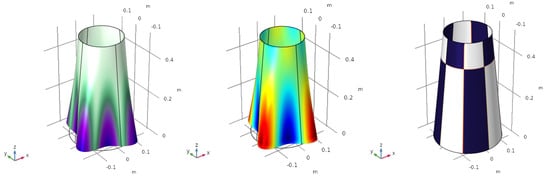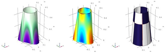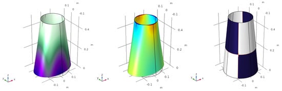 The electrode profile for the first four vibration modes (with increasing natural frequencies) is obtained in this section. Once again, the cone is clamped at its upper side. The mode shapes (eigenvectors of the equilibrium equation) are
