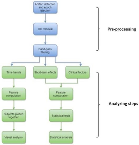 The full outline of the analytic process is shown in Figure 1. A thorough description of the methods and the detailed introductions to the chosen approaches have been thoroughly described before [24]. The full analytic scripts are also available from the authors at request. A brief description of the key aspects of the computational methods is as follows: The recordings were first reviewed visually for a rough data quality check (Figure 1). The signals in the recording montage were then exported into European Data Format and further analysis was performed using a custom-made Matlab script (https://www.mathworks.com) (accessed on 15 November 2022), which included preprocessing for automated artifact detection and removal. The artifact detection algorithm consisted of three separate functions: evaluating the amplitude as well as high and low frequency artifacts [24].