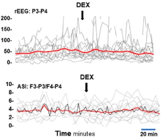 Visual inspection of the aEEG trends of the 4 h recordings before and after DEX administration showed a random fluctuation, and neither rEEG nor ASI showed any consistent or longer standing changes (Figure 4).
