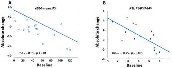 Correlation between the absolute change and the baseline. Scatterplot of the rEEG mean from channel F3 (A) and the ASI mean from channels F3-P3/F4-P4 (B) using Spearman´s test.