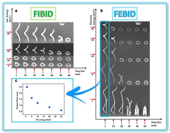 Plasmonic spiral structure and its fabricating process based on Focused Ion−beam (FIB). (a) SEM representation of the 3D FIBID nanohelix growth as a function of ion energy and step size. (b) SEM representation of the 3D FEBID nanohelix growth as a function of ion energy and step size. (c) In FEBID process, the single loop nanohelix VP strongly depends on the primary electron acceleration voltage. (d) Array of 20 × 20 3D chiral plasmonic nanohelices fabricated by FIBID. (e) Array of 40 × 40 3D chiral plasmonic nanohelices realized by FEBID. Reproduced with permission from reference [34]. Copyright 2015 American Chemical Society.