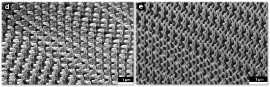Recently, Esposito et al. prepared a three-dimensional chiral plasmonic spiral structure (Figure 2) by focused ion-beam-induced deposition (FIBID) and focused-electron-beam-induced deposition (FEBID) [34]. The complex three-dimensional spiral nanostructure shows strong chiral plasmonic activity. The chiral structure fabricated by FIBID indicates broadband polarization selection is about 600 nm and maximum dissymmetry factor up to 40% in the near infrared region. The chiral structure fabricated by FEBID bespeaks a highly selective dichroic band shifted towards shorter wavelengths and a maximum dissymmetry factor up to 26% in the visible range. Moreover, a finite difference time domain (FDTD) model is established that can design plasmonic structures to achieve desired optical response by controlling the actual size and geometric characteristics of the surface plasmonic spiral metamaterial [35].