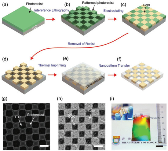 Plasmonic checkerboard structure and its fabricating process based on Holographic Lithography (HL). (a–f) The schematic diagram of manufacturing gold nanocheckerboard structure (ITO: indium tin oxide). (g) SEM image of the nanocheckerboard pattern prepared by HL on photoresist. (h) SEM image of the nanocheckerboard structure inserted in a cyclic olefin copolymer (COC) film. (i) Photographs of the plasmonic film with gold nanocheckerboard metasurfaces. Reproduced with permission from reference [39]. Copyright 2019 WILEY-VCH Verlag GmbH & Co. KGaA, Weinheim.
