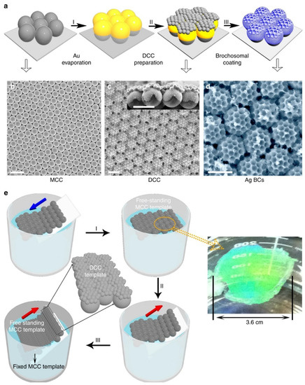 Recently, Yang and co-workers demonstrated a football-like antireflective surface microstructure inspired by leafhoppers. This unique structure is obtained by electrochemical deposition on the template of double-layer colloidal ball. The specific preparation process is shown in Figure 4. The first layer of template is obtained by self-assembly of a single layer of larger microspheres on the interface between water and air. After depositing a layer of gold film, a layer of smaller microspheres is self-assembled on the first layer of template to obtain a double-layer colloidal sphere template. Then, silver is deposited to fill the gap of the template and connect with the gold film. Finally, the microspheres are removed to obtain a unique soccer-like plasmon structure. It has been proved that the structure prepared by the above method for 2 μm thick silver can reflect <~1% any wavelength at 250–2000 nm wavelength. The excellent anti-reflective function can be applied to plasmonic sensing devices [51].