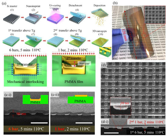 - Zhao, Z.-J.; Ahn, J.; Hwang, S.H.; Ko, J.; Jeong, Y.; Bok, M.; Kang, H.-J.; Choi, J.; Jeon, S.; Park, I.; et al. Large-Area Nanogap-Controlled 3D Nanoarchitectures Fabricated via Layer-by-Layer Nanoimprint. ACS Nano 2021, 15, 503–514. [Google Scholar] [CrossRef]