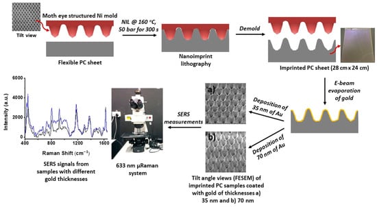 In addition, a flexible plasmonic sensor composed of Au nanocones based on nanoimprinting technology is demonstrated by Suresh’s group. The geometry of the Au nanocones is adjusted by the mold of NIL, and the gaps between nanocones are controlled by the thickness of the deposited gold (Figure 6). The plasmonic structure obtained by this fabricating method has high sensitivity for surface-enhanced Raman spectroscopy (SERS) to detect analytes, and its advantages of high resolution, high throughput and low cost make available for mass production in industry [60].