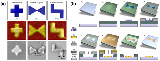 - Shen, B.; Linko, V.; Tapio, K.; Pikker, S.; Lemma, T.; Gopinath, A.; Gothelf, K.V.; Kostiainen, M.A.; Toppari, J.J. Plasmonic Nanostructures through DNA-Assisted Lithography. Sci. Adv. 2018, 4, eaap8978. [Google Scholar] [CrossRef] [PubMed]
