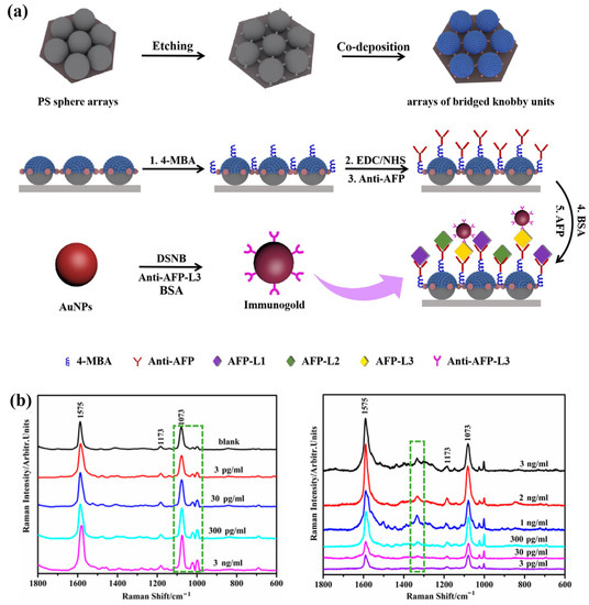 Surface-enhanced Raman spectroscopy (SERS) can provide unique molecular “fingerprint” information by identifying the shift and intensity change in spectral signal [69]. The preponderances of high sensitivity and simple operation make it have broad application prospects in detection of cancer markers. For example, in the recent report of Cheng et al., a kind of array of bridged knobby units is fabricated by combining NSL, RIE and magnetron sputtering for detection of hepatocellular carcinoma (HCC) (Figure 8). This unique structure significantly enhances the sensitivity of detection owing to changing the distribution of hot spots between plasmonic structures and quantitatively analyses the concentrations of α-Fetoprotein (AFP) and AFP-L3 according to the change in frequency and strength in SERS. Using these plasmonic biosensors for detection of HCC is faster, more convenient and sensitive. The detection limit of AFP and AFP–L3 is reduced to 3 pg/mL in this work [70].
