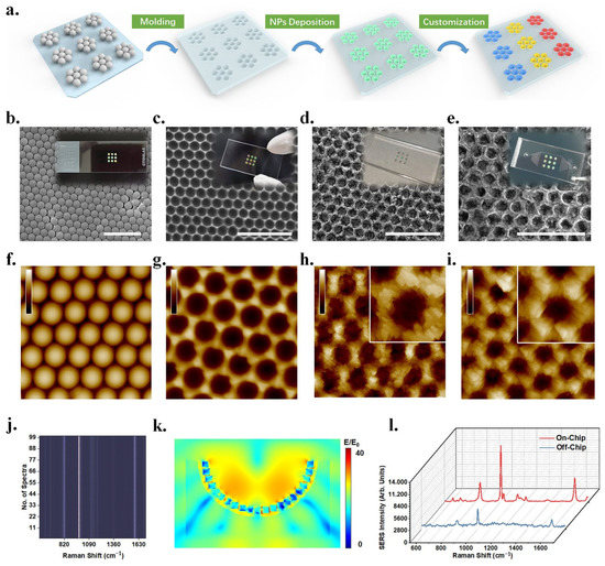 - Zhu, A.; Zhao, X.; Cheng, M.; Chen, L.; Wang, Y.; Zhang, X.; Zhang, Y.; Zhang, X. Nanohoneycomb Surface-Enhanced Raman Spectroscopy-Active Chip for the Determination of Biomarkers of Hepatocellular Carcinoma. ACS Appl. Mater. Interfaces 2019, 11, 44617–44623. [Google Scholar] [CrossRef]
