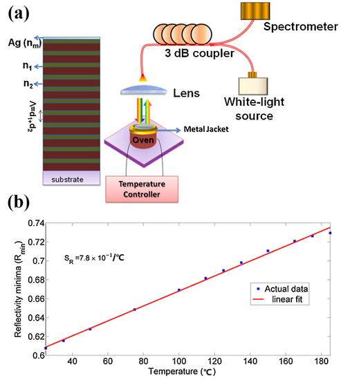 Construction and test result of the plasmonic temperature sensor based on Tamm-plasmon-polariton (TPP). (a) Typical metal-distributed-Bragg-reflector structure and the schematic diagram of excitation experiment device. (b) Graph of minimum reflectivity versus temperature sensed by temperature-sensor-based Tamm-plasmon-polariton. Reproduced with permission from reference [84]. Copyright 2017 Elsevier B.V.
