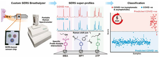 - Leong, S.X.; Leong, Y.X.; Tan, E.X.; Sim, H.Y.F.; Koh, C.S.L.; Lee, Y.H.; Chong, C.; Ng, L.S.; Chen, J.R.T.; Pang, D.W.C.; et al. Noninvasive and Point-of-Care Surface-Enhanced Raman Scattering (SERS)-Based Breathalyzer for Mass Screening of Coronavirus Disease 2019 (COVID-19) under 5 Min. ACS Nano 2022, 16, 2629–2639. [Google Scholar] [CrossRef] [PubMed]