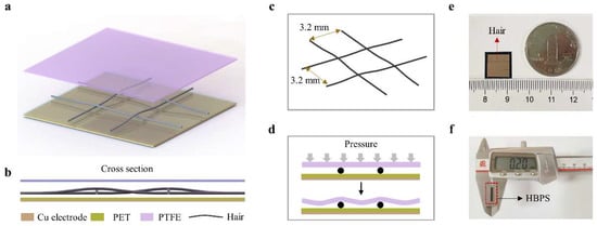The detailed mesh structure formed by lost hair, which is the core component of the proposed HBPS, is shown in Figure 1c. In two vertical directions, the distance between the two hairs was 3.2 mm. If the distance between the two hairs is too small, the PTFE film cannot effectively contact the PET film when the HBPS is stimulated by external pressure, which results in poor output performance. However, the role of the mesh structure formed by lost hair as a support layer would be weakened if the distance between the two hairs was too large. In this situation, the proposed HBPS could easily reach the saturation state under external pressure. As shown in Figure 1d, The PTFE film would develop a corresponding bending deformation when the HBPS is stimulated by external pressure, which would cause contact–separation between the tribo-pair. The electrical signals will then be generated. Figure 1e,f are optical images of the fabricated HBPS with a flexible, wearable dimension of 12 × 12 × 0.2 mm3.