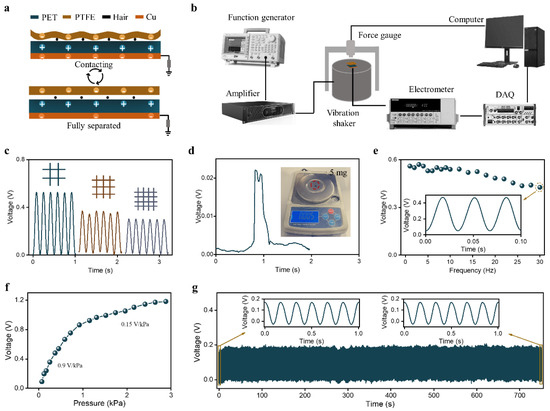 Electrical output and mechanical robustness measurements of HBPS: (a) working mechanism of HBPS, (b) self-designed testing system for acquiring a quantitative understanding of the electrical output performance of HBPS, (c) the output voltage of the HBPS composed of hair with different distance (3.2 mm, 2.4 mm, 1.9 mm), (d) output voltage of the HBPS under the pressure of a plastic sheet with 5 mg weight, (e) output voltage of the HBPS under a pressure of 0.45 kPa at frequencies ranging from 1–30 Hz, (f) pressure sensitivity of the HBPS, and (g) output stability of the HBPS.