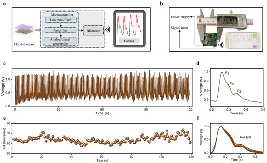 Due to its great output performance, HBPS exhibits promising potential in monitoring human epidermal pulse waves. As shown in Figure 3c, the pulse wave of a 26-year-old subject was successfully measured at the wrist. From the enlarged view of one cycle (Figure 3d), three obvious peaks are observable: P1, P2, and P3. These feature peaks are jointly generated by cardiac ejection and the reflection of tissue structure on blood, which is critical for assessing the cardiovascular system, including vascular elasticity, peripheral resistance, and degree of arteriosclerosis. Heart rate (HR) is a vital sign that indicates the state of the cardiovascular system. For a group of pulse wave signals over a period of 2 min, the real-time HR value was calculated by seeking the local maximum within a 0.6-s interval. As shown in Figure 3e, the calculated HR did not change dramatically and showed an average of 73 beats/min, indicating that the subject’s physiological condition was in a stable state for a short period of time. Of course, there were some small fluctuations in HR that were consistent with human physiological characteristics. The average correlation coefficient between the different periodic waveforms was as high as 0.9978, which indicates that the proposed HBPS has a remarkable ability to stably monitor human pulse signals.