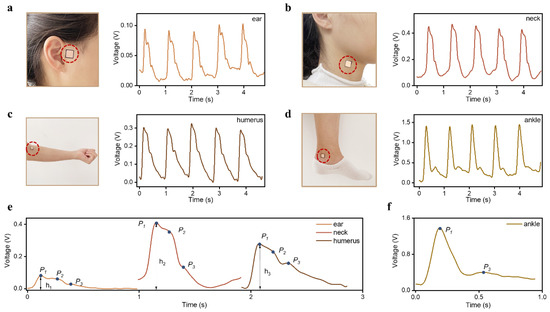 Human pulse wave monitoring at different body parts: (a) ear, (b) neck, (c) humerus, and (d) ankle; (e) pulse wave at different parts of the human body over one cycle; and (f) one cycle of pulse wave measured at the ankle.
