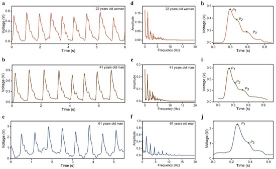 The pulse waves of different subjects: (a–c) a 22-year-old woman, a 41-year-old man, and a 61-year-old man; (d–f) the spectrum of pulse signals of different subjects; and (h–j) an enlarged view of one cycle of pulse waves of different subjects.