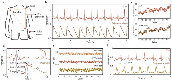Pulse transit time (PTT), the time taken for the human epidermal pulse wave to travel from the heart to the peripheral arterial position, is a potential indicator for the assessment of CVDs in medical applications [33]. The relationship between PTT and cardiovascular system status has been investigated by many researchers [34]. PTT changes regularly with changes in vascular wall elasticity, peripheral resistance, and blood viscosity [35]. Therefore, PTT-based early prevention and diagnosis of CVD has received considerable attention due to its noninvasive and comfortable measurement form [36,37]. In this work, PTT was obtained using HBPS and an electrocardiogram (ECG) lead-III. The position of the ECG electrode is shown in Figure 6a. The left arm electrode (LA) was placed where the left upper limb connected to the torso. The right arm electrode (RA) was placed where the right upper limb connected to the trunk. The left leg electrode (LL) was attached to the left hip. These three ECG electrodes were used for ECG signal acquisition. The proposed HBPS was attached to the subject’s radial artery to capture the pulse wave signals. Before measurement, the volunteer was required to remain in a resting state for 5 min. During the measurement, the volunteer was asked to maintain a comfortable sitting posture, with legs uncrossed and feet flat on the floor. The brachial artery remained at the level of the left ventricle, and the volunteer was asked to avoid talking and to also relax during the measurement. The ECG signal and pulse wave were sampled at 500 Hz via a data acquisition card (National instruments, BNC-2120).