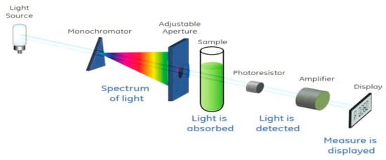 The spectrophotometer system is made up of a light source that goes through a monochromator, which is a device that divides light into separate wavelengths, and an aperture. The resolution of the light flowing through is altered by the aperture. The light then passes through the sample and is absorbed by the source. The light that reaches the detector is that which was not absorbed. A schematic of the spectrophotometer has been shown in Figure 2.