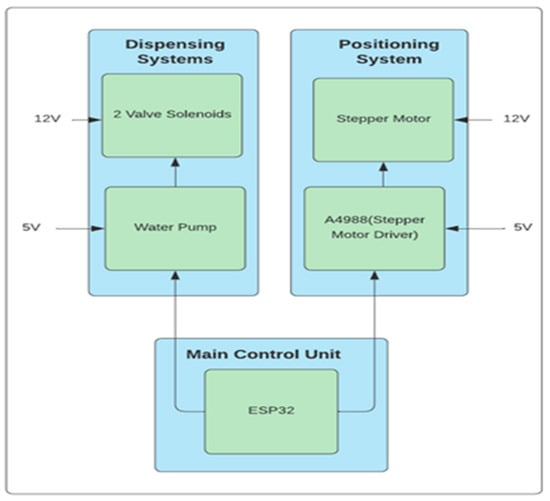 In this system, each stage of the sequence was performed by one Nema 17 bipolar stepper motor, two valve solenoids, one A4988 motor driver, and one ESP32 microcontroller. A stepper motor was utilized to spin an arm holding a cuvette across the various phases of the conveyor system. The dispensing system used a water pump to provide both water and a reagent through a 2 mL tube. When the upstream valve solenoid was shut down, the water and reagent combination was trapped in the tube. The downstream valve solenoid then opened, allowing the water and reagents to enter the cuvette. A motor driver received 5 V from an ESP32 microprocessor and 12 V from the power management system to power the stepper motor. Two digital pins were employed in the motor driver to set the stepping type and direction of each motor. The circuit required a PN2222 transistor, a 1N4001 diode, and a 250 resistor for the water pump. A sequence of instructions was written onto the ESP32 microcontroller using the Arduino integrated development environment (IDE) to accomplish duties given to the positioning and dispensing system.