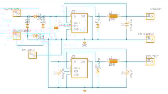 This system primarily consisted of two main steps: an AC-DC conversion system which steps down the voltage from 120 V AC supply to a 24 V DC supply, and a buck converter which takes an input of 24 V from the AC-DC converter and gives two stable output voltages of 12 V and 5 V, respectively. The entire schematic of the power management system has been depicted in Figure 4.