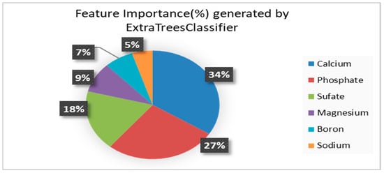 From Figure 5, calcium, magnesium, sodium, phosphates, boron and sulfate were chosen as the top 6 predictors for analysis as they had feature importance over 200. XGBoost was used as it uses Gini Impurity to rank features in order of their importance using an ensemble of decision trees, thus making it a robust approach for feature selection. The rest of the predictors were comparatively less important in our resulting analysis, due to which, it was decided to eliminate them before proceeding with the application of ExtraTreesClassifier for selection of the top three predictors which were regulated at regular intervals using an IoT based set-up.