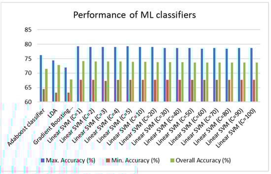Maximum, minimum and overall testing accuracy of the ML classifiers.