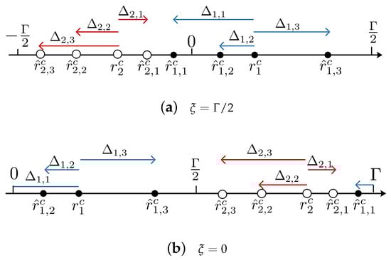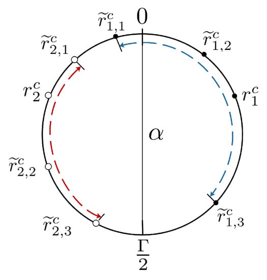 Now, we consider the first key issue stated in Section 2.3, i.e., sorting in the order such that the corresponding errors are in ascending order for each i, where . According to [21], sorting is equivalent to finding a cutting point on the circle of length and stretching it to a real axis. If for each i, the shifted common residues on the real axis are sorted in ascending order of .