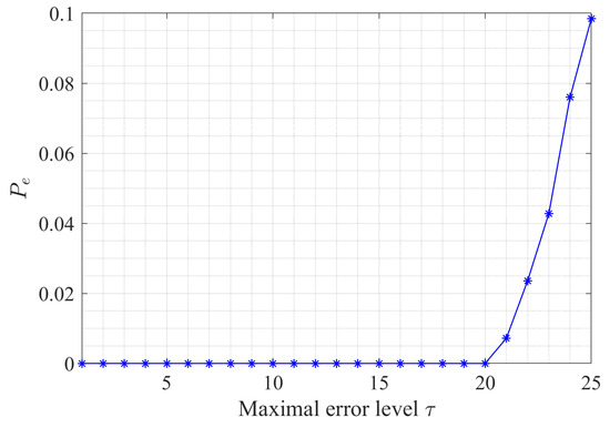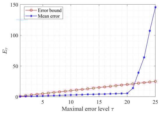 As shown in Figure 5b,d, if , the estimation error is bounded by , the probability of which is one. Once the maximal error level exceeds , the reconstruction error is almost unpredictable. In a word, our method outperforms the robust generalized CRT while slightly worse than the searching−based algorithm when . However, it’s worth pointing out that our method provides a closed−form solution that cannot be realized by the searching−based method. Then, we consider the real running time consumption, where the computing equipment is Lenovo xiaoxin Pro 13. The real running time of our method that runs for 125,000 times is about 7.96 s, while the robust generalized CRT proposed in [23] requires about 86.05 s since the algorithm involves a lot of loops. The searching-based method proposed in [29] sightly outperforms our method, which only needs about 5.75 s.
