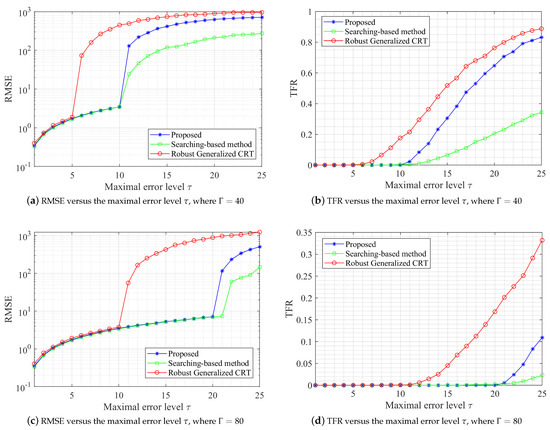 Figure 5a,c show that our method outperforms the best known robust generalized CRT, where the maximal error tolerance is improved from to . Morever, our method performs as well as the best searching−based method when the maximal error level is less than .