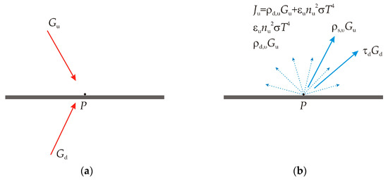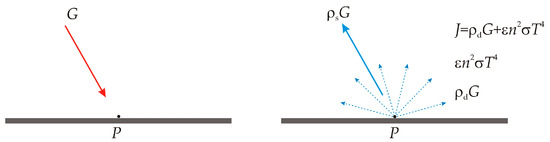Consider a body with an opaque surface which transmits no radiation. For its surface with absorptivity α, emissivity ε, diffuse reflectivity ρd, specular reflectivity ρs, refractive index n, and temperature T, if we consider a point P on that surface, there is an incoming radiative flux G called irradiation and an outgoing radiative flux J called radiosity [43], as represented in Figure 1.
