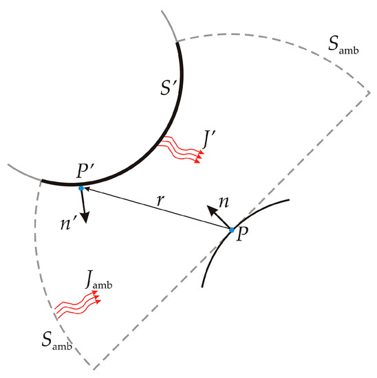 In Equation (23), Famb is the ambient view factor and Gm is the integral of the differential view factor on all visible points times the radiosity of the source point of the radiation. If we consider a point P on a surface as represented in Figure 4, it is visible by points such as P’ on other surfaces such as S’ and also from the ambient surroundings Samb.
