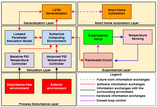 - The experimental layer stands at the core of the approach, comprising a laboratory scale experimental setup that is employed for capturing both the heat transfer and temperature control problems of interior spaces that are found in residential buildings. In this regard, temperature sensing hardware and a thermostat circuit are included. The interaction between the two materializes a closed-loop controller;