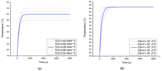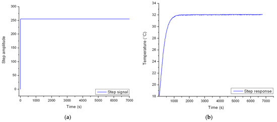 TCC and Cth can only be identified by evaluating the step response of the real-world experimental setup. To this end, the PWM signal is set to its limit value. This change takes place in one second, causing the heat that is dissipated by the resistors to max out. The objective of the experiment is to evaluate the temperature of the fluid domain inside the enclosure, until an equilibrium value is reached. The study was carried out in an open space environment that has a constant ambient temperature of 18 °C throughout the test sequence. Figure 10a depicts the shape of the actuating signal while Figure 10b illustrates the time vs. temperature curve.