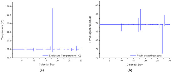 However, Figure 24 emphasizes localized situations when the actuating signal exceeds the lower saturation limit bounds (also on the 27 November). In this case, the PWM signal has a negative value of –0.15 that cannot occur in practice. Changes are required to the proposed algorithm for filtering such values.