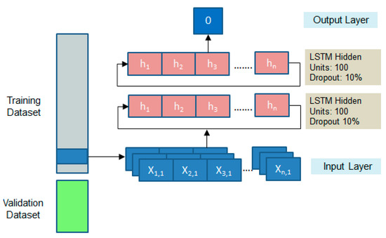 The LSTM recurrent neural network is employed to generalize the behavior of the actuating signal based on the weather conditions and interior temperature. In the proposed model, the input layer consists of a 3D array comprising sequential data regarding the ambient temperature (°C), humidity (%), wind speed (Km/h), and interior temperature (°C). All features were normalized by employing the min–max scaling technique. A stack of two LSTM layers is added to capture the abstract concepts in the sequences. The rectified linear unit is used as activation function. The generalization ability of the model is improved by employing the dropout regularization method. Thus, LSTM units are randomly excluded during the training process. The choice of hidden units and dropout rates that ensure an optimal convergence were decided as: 100 hidden units for both layers, having a dropout rate of 10% (Figure 22).