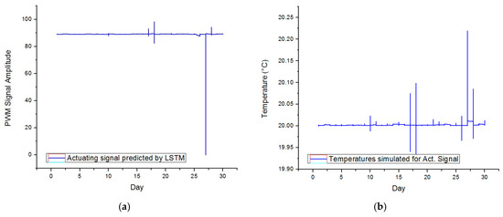 The LSTM methodology is further employed for predicting the behavior of the tuned controller for November 2021.To this end, the inputs of the model consist of the weather condition and the temperatures recorded inside the enclosure (derived from the simulation model). The information is extracted for intervals of 30 min. Thus, the resulting test dataset includes a total of 1440 rows. Figure 24 depicts the shape of the predicted actuating signal and the temperatures achieved by simulation for the given inputs.