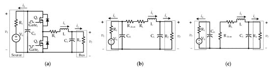 In this configuration, a voltage source and a DC bus are respectively located on the high-voltage side and low-voltage side of the converter. and are the voltage at the high and low sides of the converter, respectively. denotes the internal resistance of the voltage source, whereas, in the simplest case, is considered to be a load resistance. The inductor L is accompanied by a parasitic resistance, . indicates the MOSFET turn-on resistance. Capacitor and represent the input and output capacitor of the converter, respectively. and are two active switches that are directly controlled by two complementary gating signals and , separately. As a result, the inductor current , the input current , and the output current can fundamentally flow in both directions. Because of the complementary control signal, no matter what mode (buck or boost) the bidirectional converter is in, there are only two states, namely State 1 ( ON– OFF) and State 2 ( OFF– ON). These states are described by equivalent circuits as shown in Figure 1b,c. The governing equation sets for these states can be expressed as: