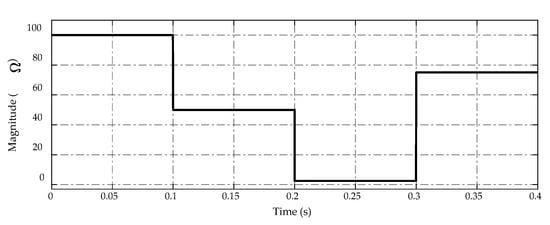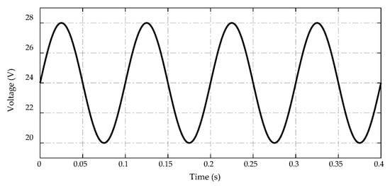 For this test, a sinusoidal power supply of is applied to the high-voltage side of the DC/DC converter. The trajectory of this input voltage is described in Figure 16.