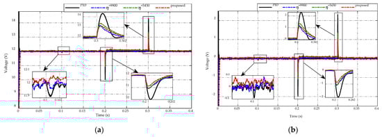 Figure 11 presents the comparison of the low-voltage side response under buck/boost mode switching between the proposed ES-based adaptive scheme compared to the PID control and the other two constant switching gains. The voltage-tracking performances of all strategies are described in Figure 11a, while Figure 11b depicts the corresponding comparative tracking error. It can be seen that the primary target at the low side is to maintain the desired voltage at 12 V. Thus, it is necessary to reduce the voltage chattering and peaking magnitude when switching modes occur to guarantee the voltage quality. Specifically, during the steady-state period of buck and boost mode, the low-voltage side of all control strategies achieves good tracking performance, allowing the obtained voltage to remain constant at 12 V. Meanwhile, the low-voltage side of PID control has the highest peaking magnitude of approximately 3 V when the current source switches from buck mode to boost mode at with the current change from −2 A to 4 A, while the constant switching gain takes a smaller peaking magnitude of 2 V, and the proposed scheme and other constant switching gain achieve the smallest peaking value of 1.8 V. For the working mode changes from boost to buck at , the proposed adaptive scheme achieves the greatest voltage regulation with the peaking value about −1.2 V, while these peaking magnitudes of other strategies are −1.3 V, −1.5 V, and −2.5 V for the PID control, constant switching gains , and , respectively. Similarly, when switching from buck to boost mode at with a current change from −1 A to 2 A, the peaking voltage is 1.5 V when using PID control, while the smaller values are 0.8 V and 0.7 V when using and proposed adaptive scheme, respectively. The use of adaptive gain achieves the highest voltage response with a peaking magnitude of 0.65 V. The obtained results demonstrate the necessity of adjusting the switching gain in order to decrease peaking phenomena and improve the tracking accuracy for bidirectional DC-DC converter voltage regulation.
