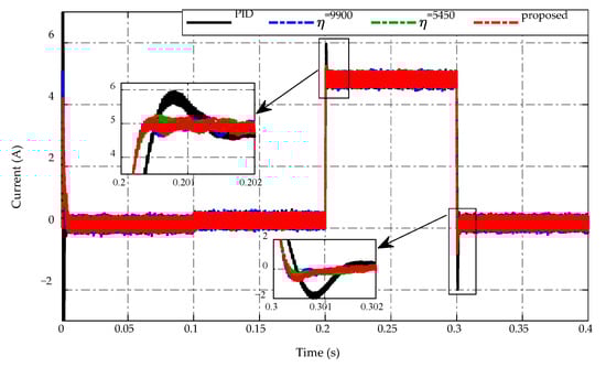 The inductor currents of four control strategies are presented in Figure 6. Overall, the proposed strategy improves inductor current performance while reducing current ripple under steady-state working conditions. Meanwhile, when using the PID control, the peaking current value at is 6 A, which is greater than 1 A in comparison to other strategies. When the load is drastically changed at , the inductor current adaptation of PID control also performs poorly because the magnitude increases to −2 A, whereas the inductor current of the proposed strategy and two constant switching gains achieves roughly −1 A.