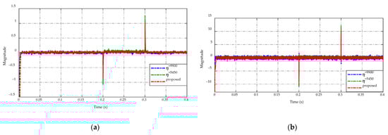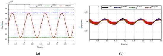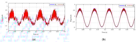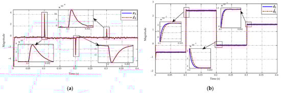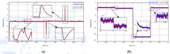 The estimation results of the state and the mismatched disturbance are shown in Figure 19. The actual values of state and disturbance can be estimated with high precision of estimated state and the estimated mismatched disturbance , see Figure 19a,b. The proposed observer can achieve the magnitude of state and mismatched disturbance in the range of and , respectively. It can also guarantee that the estimated error converges to zero under the conditions of input voltage variation.