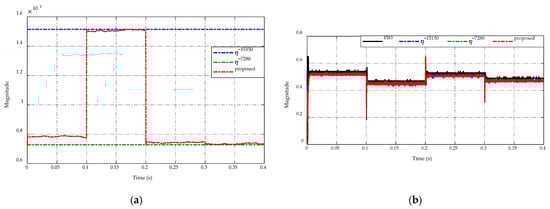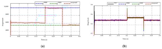 The comparison of switching gain adaptation and the duty cycle command is presented in Figure 15a,b, respectively. As shown in Figure 15a, the proposed ES-based adaptation allows for the adjustment of switching gain to ensure the tracking performance and chattering reduction of the high-side and low-side voltages based on the switching modes of the bidirectional DC/DC converter. As a result, the highest and lowest gains are obtained with and , respectively. In Figure 15b, the duty cycle command of the PID control and two constant switching gains have the same level during the steady-state working condition. Meanwhile, the proposed strategy produces a smaller duty cycle magnitude than others. When the converter switches the operation modes at , the duty cycle of four control strategies exhibits the same value of peaking magnitude. Thus, it can be seen that the flexibility of adaptive gains can make sure chattering reductions while also improving the voltage tracking precision.